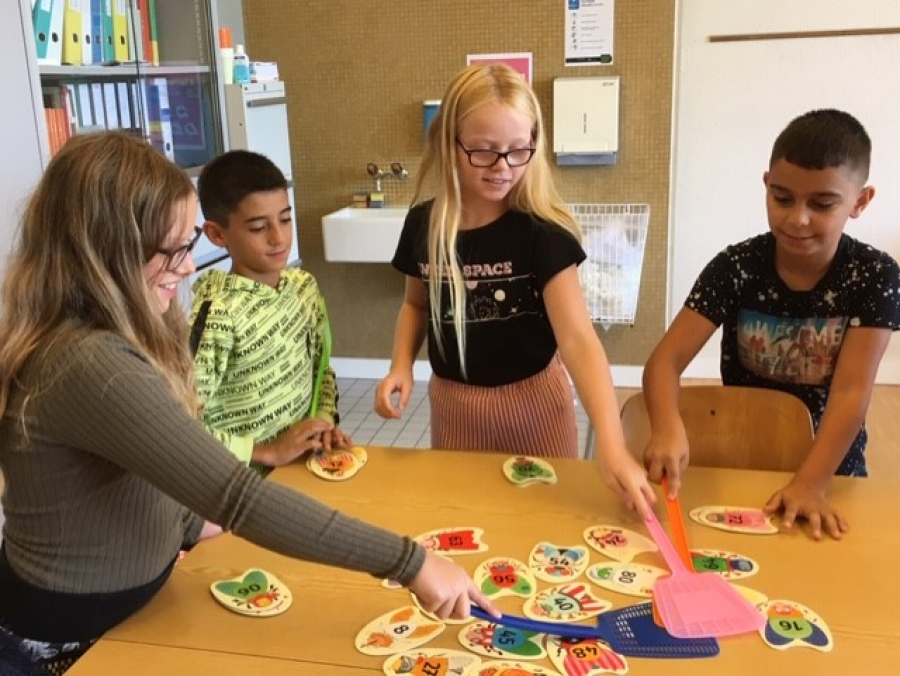 Die Schüler und Schülerinnen formulieren Mal – Aufgaben und der Schnellste in der Gruppe klatscht mit der Fliegenklatsche auf die «Fliege» mit dem richtigen Resultat.
