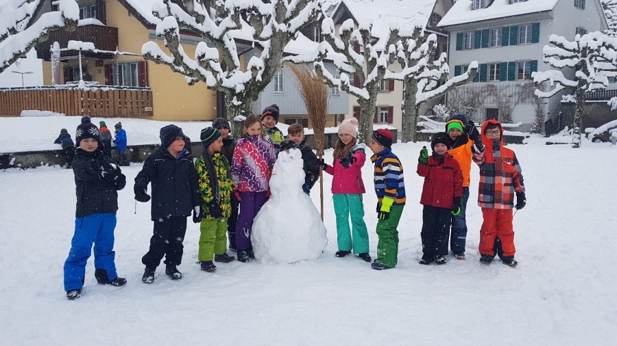 Bei so viel Schnee durfte die Klasse 2a etwas früher in die Pause gehen. Es war eine lustige Pause. Schneebälle wurden geworfen und tolle Schneemänner und Schneefrauen gebaut. Da die Kinder so viel Spass hatten wurde die anschliessende Turnstunde ebenfalls im Schnee abgehalten.