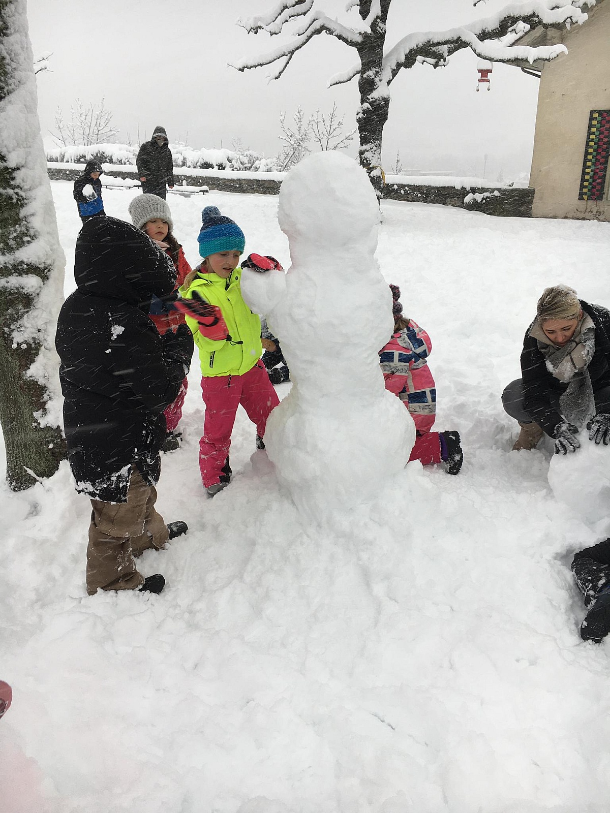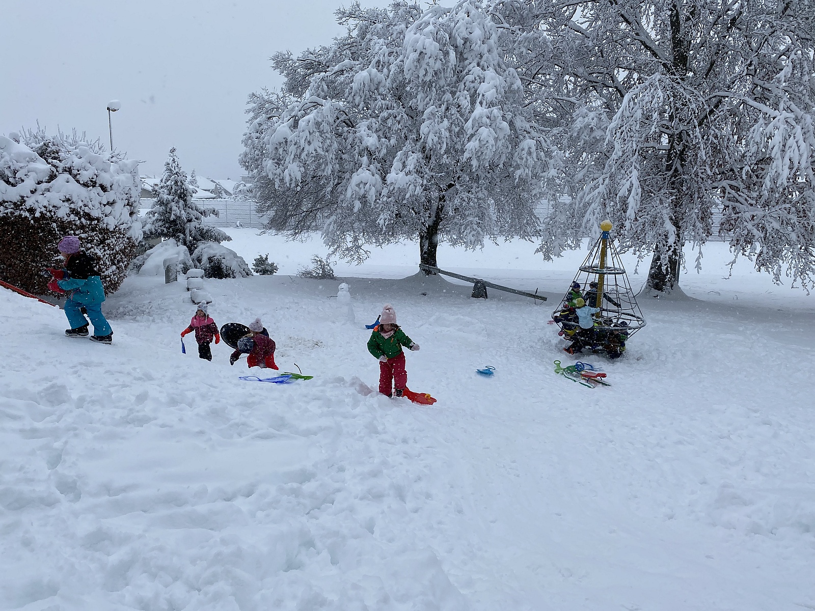 Dank der fleissigen Frau Holle durften wir am Freitagmorgen Unmengen von Schnee bei uns auf dem Bühl begrüssen. Ganz spontan entschieden sich die Kindergartenlehrpersonen dafür, das Turnen nach draussen zu verschieben. Dick eingepackt und teilweise mit Schlitten kamen die Kinder, bereits mit einem breiten Lachen auf dem Gesicht, im Kindergarten an. Der Schnee war perfekt und liess keine Schneewünsche unerfüllt. Die Kinder bauten fleissig Schneemänner, Schneefrauen und Schneeburgen und schlittelten mit Höchstgeschwindigkeit den Hang hinab.